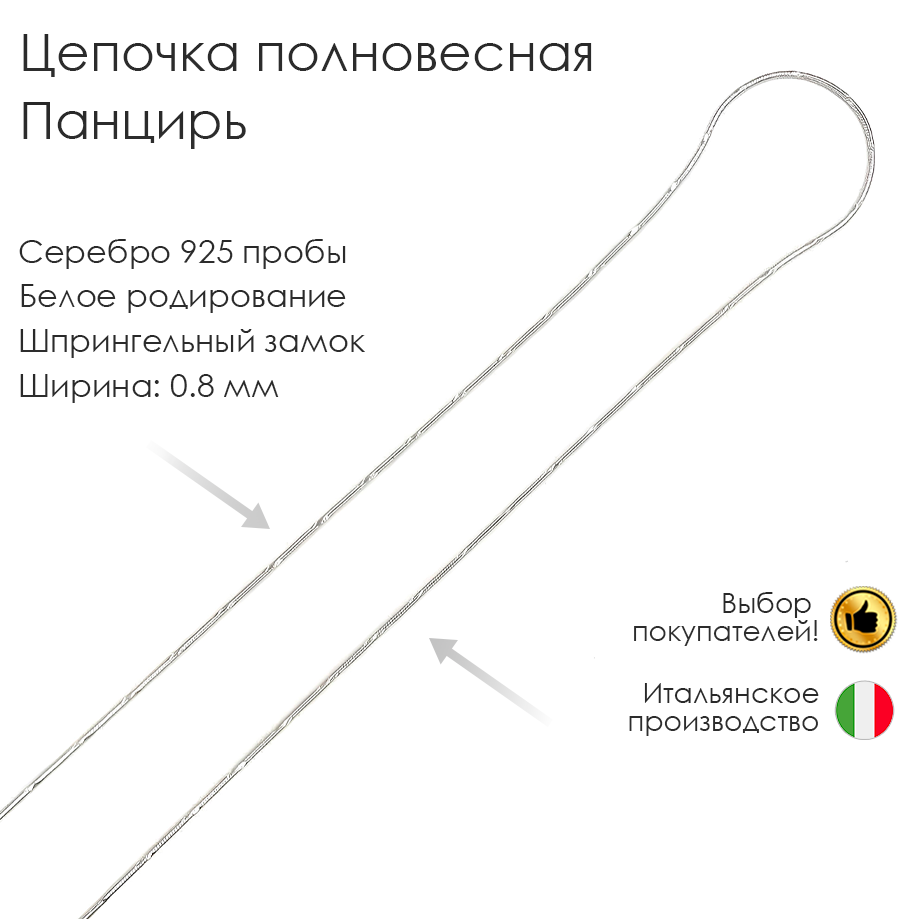 Итальянская цепочка изготовлена из серебра 925 пробы, что гарантирует ее высочайшее качество и долговечность. Родиевое покрытие придает изделию невероятный блеск и устойчивость к царапинам и потускнению.